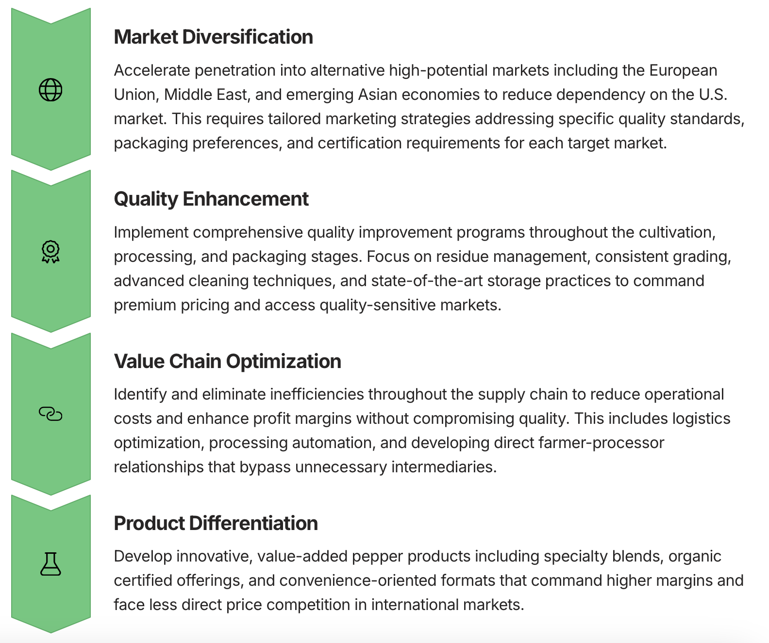 Industry experts have outlined a comprehensive set of strategic responses that Vietnamese pepper stakeholders should consider implementing to navigate the complex challenges presented by changing market dynamics and potential trade barriers. These strategies focus on market diversification, quality enhancement, and value chain optimization to ensure sustainable competitiveness in a rapidly evolving global marketplace.