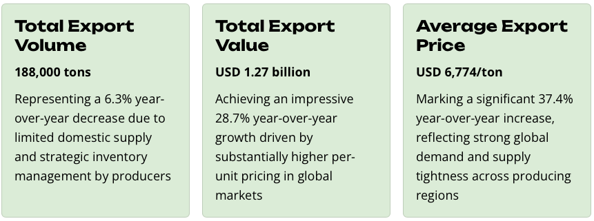 The average export price for that month reached USD 6,555 per ton, showing modest but positive month-over-month growth of 0.2% and a healthy 1.5% increase compared to September 2024. These figures suggest sustained pricing power despite the gradual moderation from peak levels earlier in the year.