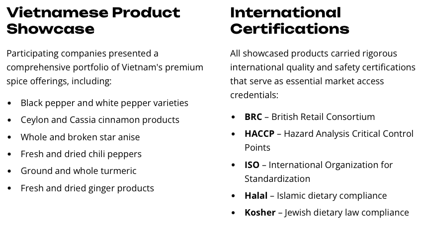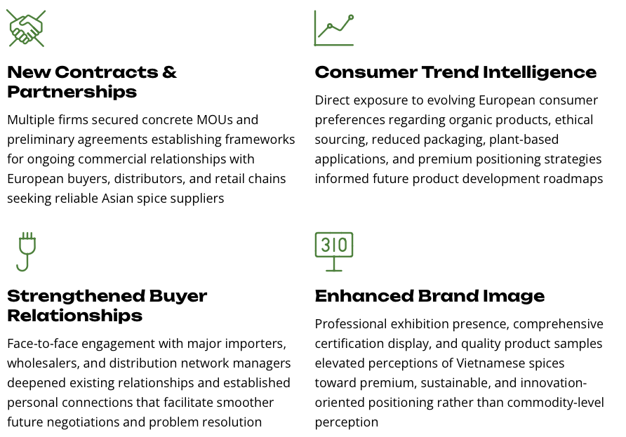 The Vietnamese pavilion attracted substantial buyer interest from the opening day of Anuga 2025, with consistent foot traffic from European procurement managers, distributors, and retail chain representatives. Several participating Vietnamese firms successfully concluded preliminary negotiations and signed Memoranda of Understanding (MOUs) establishing frameworks for future export cooperation. European buyers consistently praised Vietnamese spices for their superior quality, comprehensive safety documentation, and end-to-end traceability systems. These attributes were identified as sustainable competitive advantages that position Vietnam favorably for long-term partnership development rather than merely transactional supplier relationships.