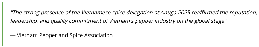 Under the framework of Vietnam’s National Trade Promotion Program 2025, the Vietnam Pepper and Spice Association (VPSA) orchestrated a high-impact business delegation to key European markets, specifically targeting Germany and the Netherlands. The centerpiece of this initiative was participation in Anuga 2025, the world’s leading international food and beverage trade fair held October 4-8 in Cologne, Germany. This prestigious event attracts thousands of buyers, distributors, and industry decision-makers from across the globe, making it an invaluable platform for market development and relationship building.
