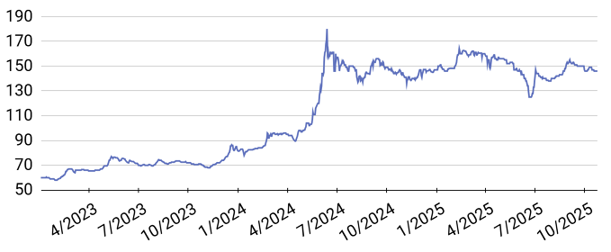Pepper price developments in the Central Highlands and Southeast from First 2023 to Oct 27, 2025 (Unit: VND/kg)
