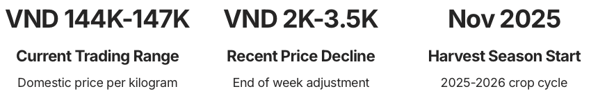 The incoming harvest season will test market absorption capacity, with experts anticipating modest price pressure of VND 1,000-2,000 per kilogram as fresh supply enters circulation. However, supportive macroeconomic conditions and strong year-to-date export value provide a cushion against significant price deterioration.