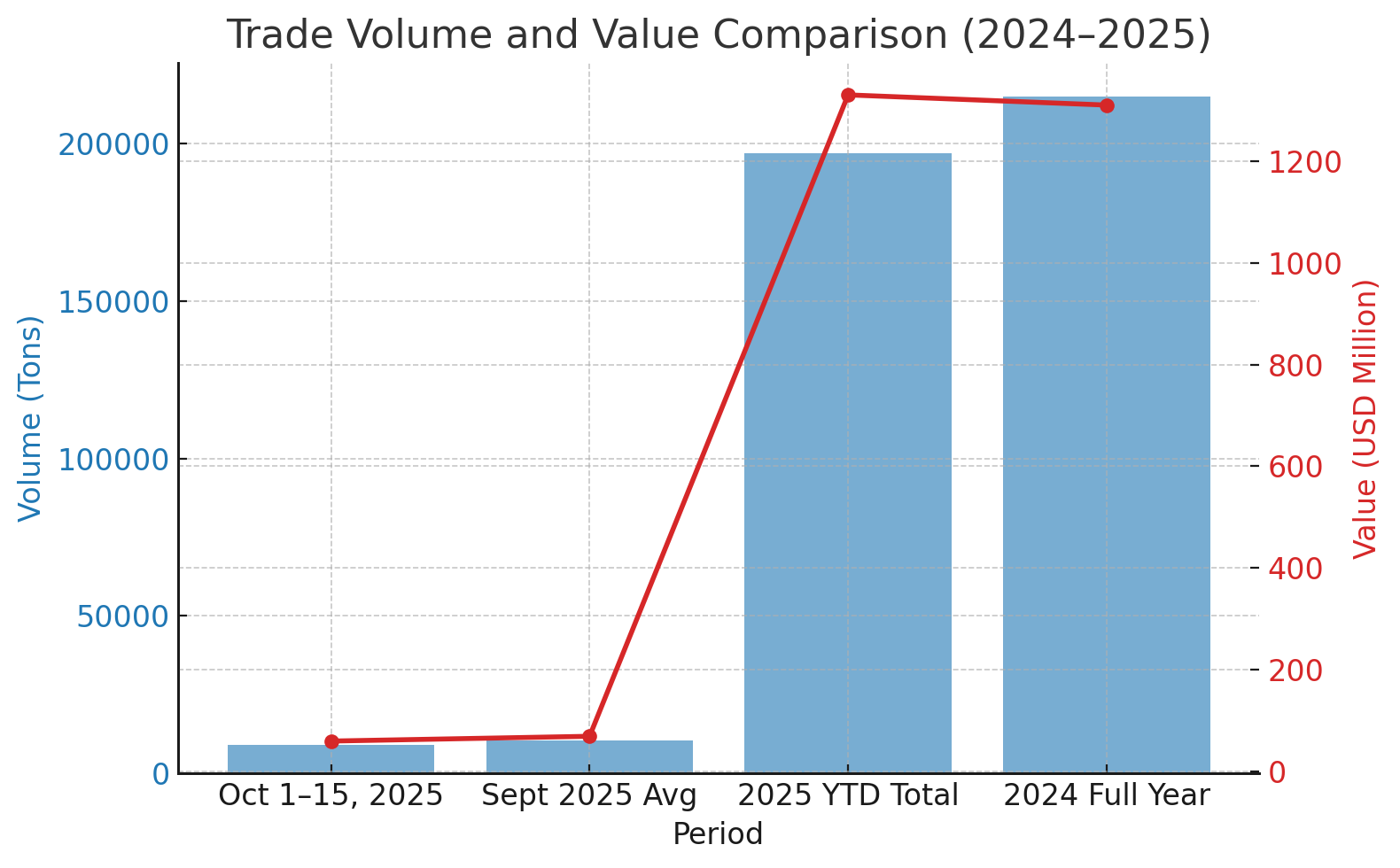Year-to-date cumulative exports through October 15 reached 197,100 tons generating USD 1.33 billion in revenue, already surpassing the entire 2024 annual export value of USD 1.31 billion. This remarkable achievement demonstrates Vietnam’s strengthened market position and improved pricing power, even as total volume remains below the previous year’s pace.