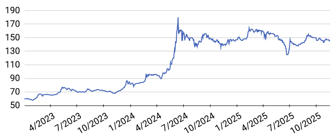 Pepper price developments in the Central Highlands and Southeast from First 2023 to Nov 17, 2025 (Unit: VND/kg)