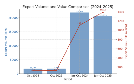 The first 10 months of 2025 have been exceptional for Vietnam’s agricultural sector. According to the Ministry of Agriculture and Environment, key export commodities such as coffee, pepper, and fruits & vegetables have all achieved record-high export values. This remarkable performance positions Vietnam favorably to meet its ambitious export targets.