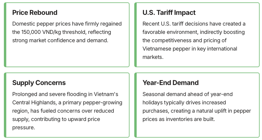 Over the past week, domestic pepper prices in Vietnam have seen a significant surge, ranging between 148,000 – 150,000 VND/kg, firmly reclaiming the 150,000 VND/kg threshold. This positive trajectory is attributed to a confluence of factors. Experts point to the strategic impact of U.S. tariff decisions, which have inadvertently shifted market dynamics in favor of Vietnamese exports. Additionally, severe and prolonged flooding in the crucial Central Highlands growing regions has raised significant concerns about future supply, prompting buyers to secure inventory and driving up prices. The inherent seasonal demand as year-end holidays approach also plays a pivotal role, with a natural increase in purchasing activity further bolstering the market. These elements combined have created a robust environment for pepper price appreciation.