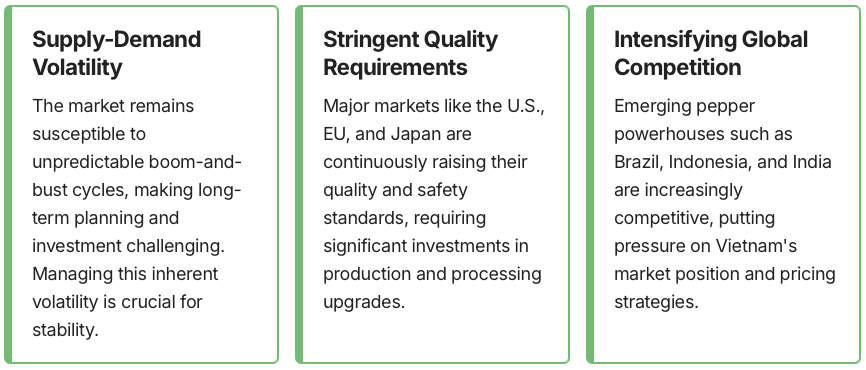 Despite the impressive resurgence, the Vietnamese pepper industry must navigate significant challenges to sustain its growth trajectory. While the U.S. and EU collectively account for over half of Vietnam’s total pepper export value, their stringent market requirements pose continuous hurdles. Maintaining market share and expanding further within these lucrative regions demands constant adaptation and adherence to evolving standards.