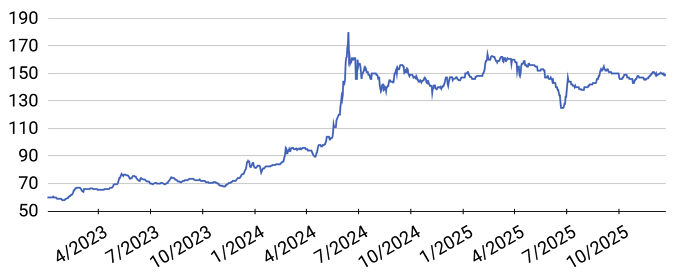 Pepper price developments in the Central Highlands and Southeast from First 2023 to Nov 10, 2025 (Unit: VND/kg)