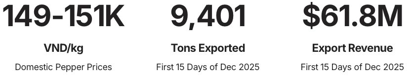 Domestic pepper prices have maintained a steady course, ranging between VND 149,000 – 151,000/kg. This stability is a testament to the resilience of Vietnamese farmers and a favorable shift in market dynamics. The first half of December 2025 alone saw impressive export figures, with 9,401 tons of pepper shipped globally, generating a substantial revenue of USD 61.8 million.