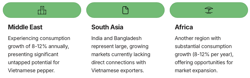 These underexploited markets offer a strategic avenue to offset potential volatility from the US–EU markets. By actively pursuing these regions, Vietnam can diversify its export portfolio and build a more resilient pepper industry.