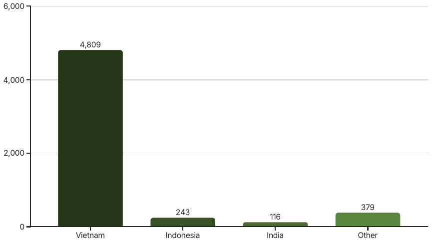 Vietnam maintained its position as the primary supplier, accounting for 68.6% of total U.S. imports with 44,549 tons, despite a 37.0% year-on-year decrease in its own export volume to the U.S.