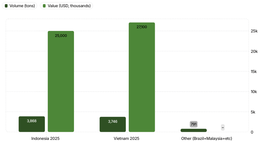 Interpretation: Indonesia remained the single largest-volume supplier but saw steep declines (–32.6% volume). Vietnam delivered near-equal volume yet generated the highest export value, implying a markedly higher average unit price and stronger revenue performance.