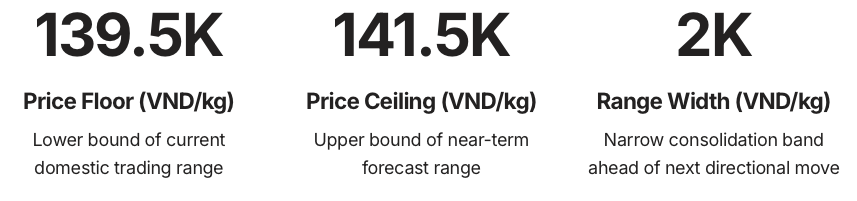 Short-term forecasts point to continued movement within the 139,500 – 141,500 VND/kg corridor before a clearer directional trend materializes. Traders should expect range-bound conditions to persist through the near term, with breakout signals likely tied to export order flow and currency movements.