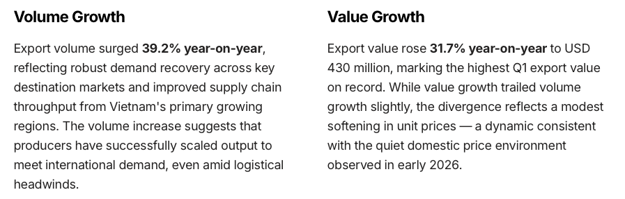 According to preliminary data from the Vietnam Pepper and Spice Association (VPSA), Vietnam delivered its strongest first-quarter export performance on record by the end of Q1 2026. The country exported 66,350 tons of pepper, generating USD 430 million in export revenue — a remarkable achievement that underscores the resilience and growing competitiveness of Vietnam’s pepper sector on the global stage.
