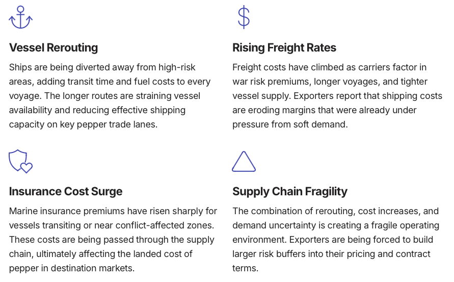 Exporters across the pepper supply chain are confronting a dual squeeze: weakening demand on the buy side and sharply rising logistics costs on the supply side. Vessels servicing key trade lanes are being forced to reroute to avoid high-risk maritime zones, adding significant distance, time, and cost to every shipment. These disruptions are having a measurable impact on exporter margins and are feeding through to pricing dynamics at origin.
